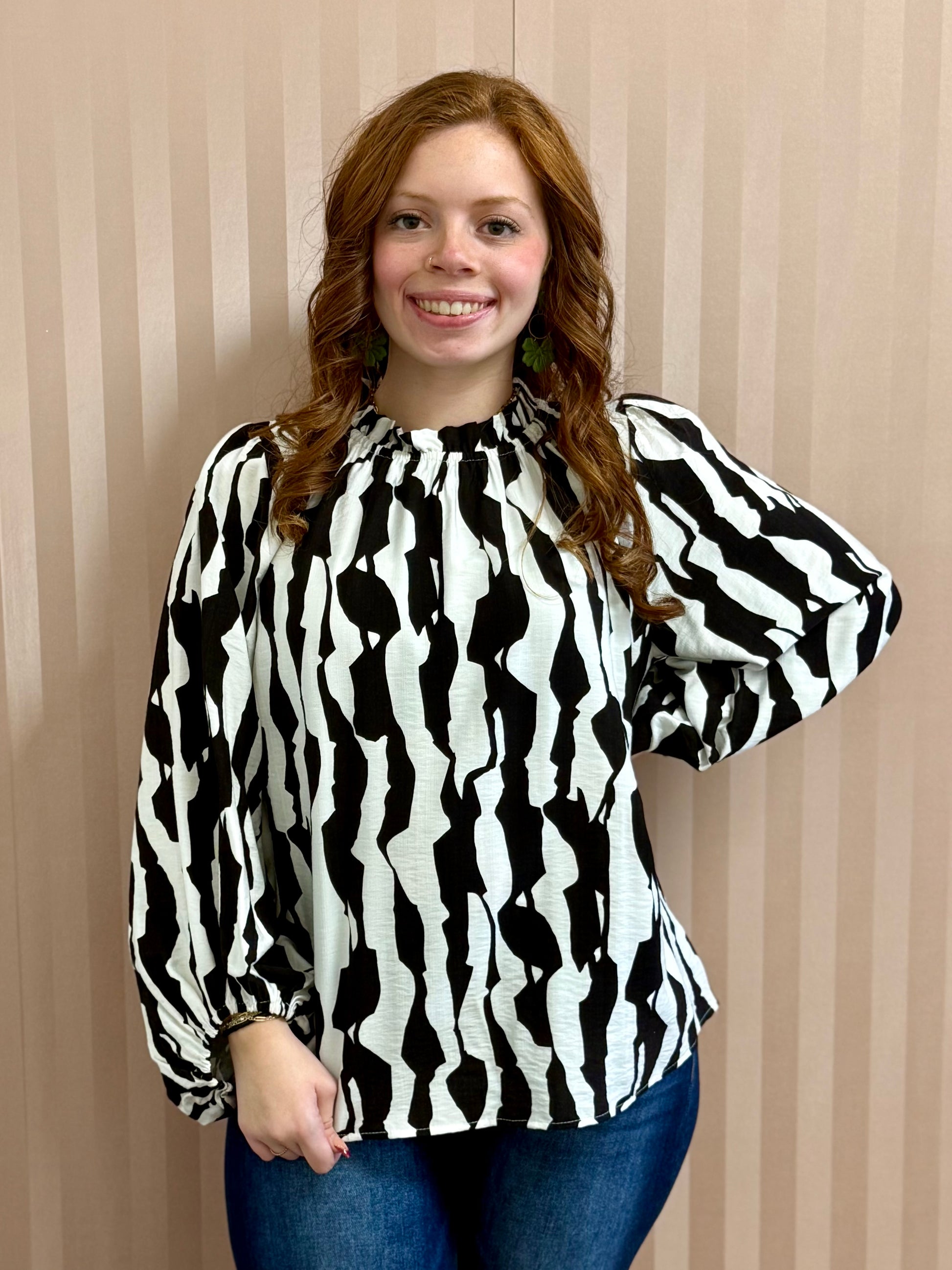 Geometric print top with a stretch-band neck and balloon sleeves; Top is lightweight.