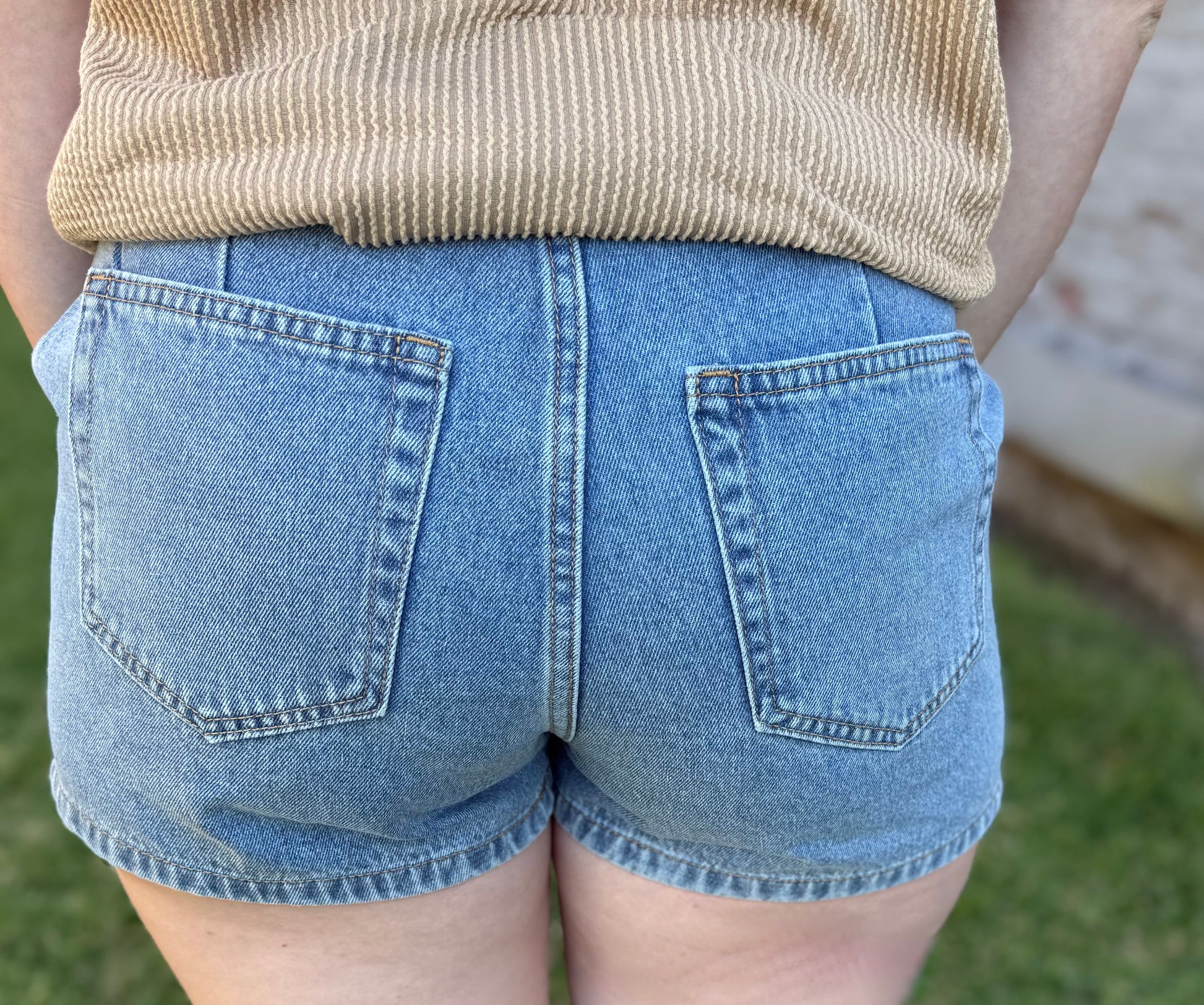 THIS DENIM SKORT WITH A HIGH TO MID WAIST WITH FRONT POCKETS AND BACK PATCH POCKETS. FRONT WRAP CLOSURE WITH HIDDEN ZIPPER AND METAL BUTTON CLOSURES.