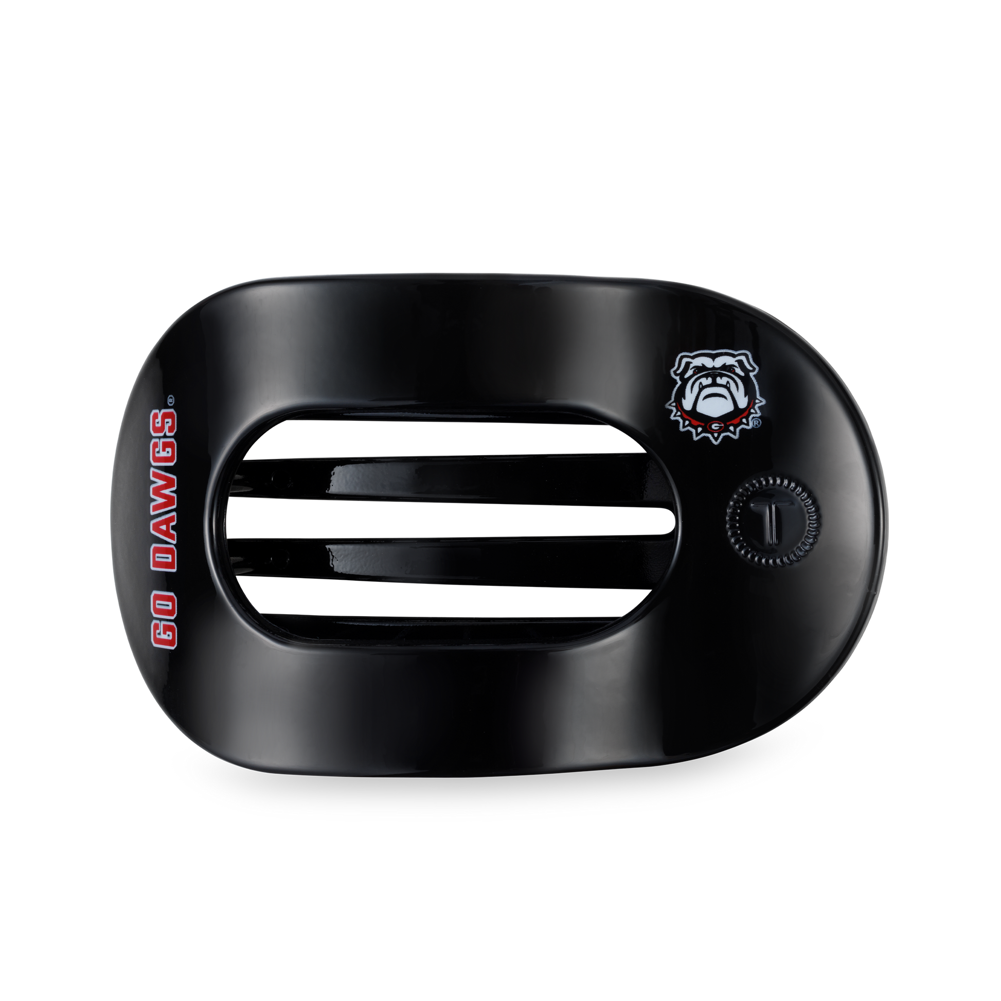 Lay flat and relax with the new TELETIES University of Georgia, Go Dawgs! Large Flat Round Hair Clip in Black and Red. This hair clip is designed to allow you to lay back flat, do yoga, or sit comfortably in a seat with a headrest, and it is made with the same material that is nearly unbreakable. Shop your favorite University of Georgia hair accessories now! Go Dawgs!