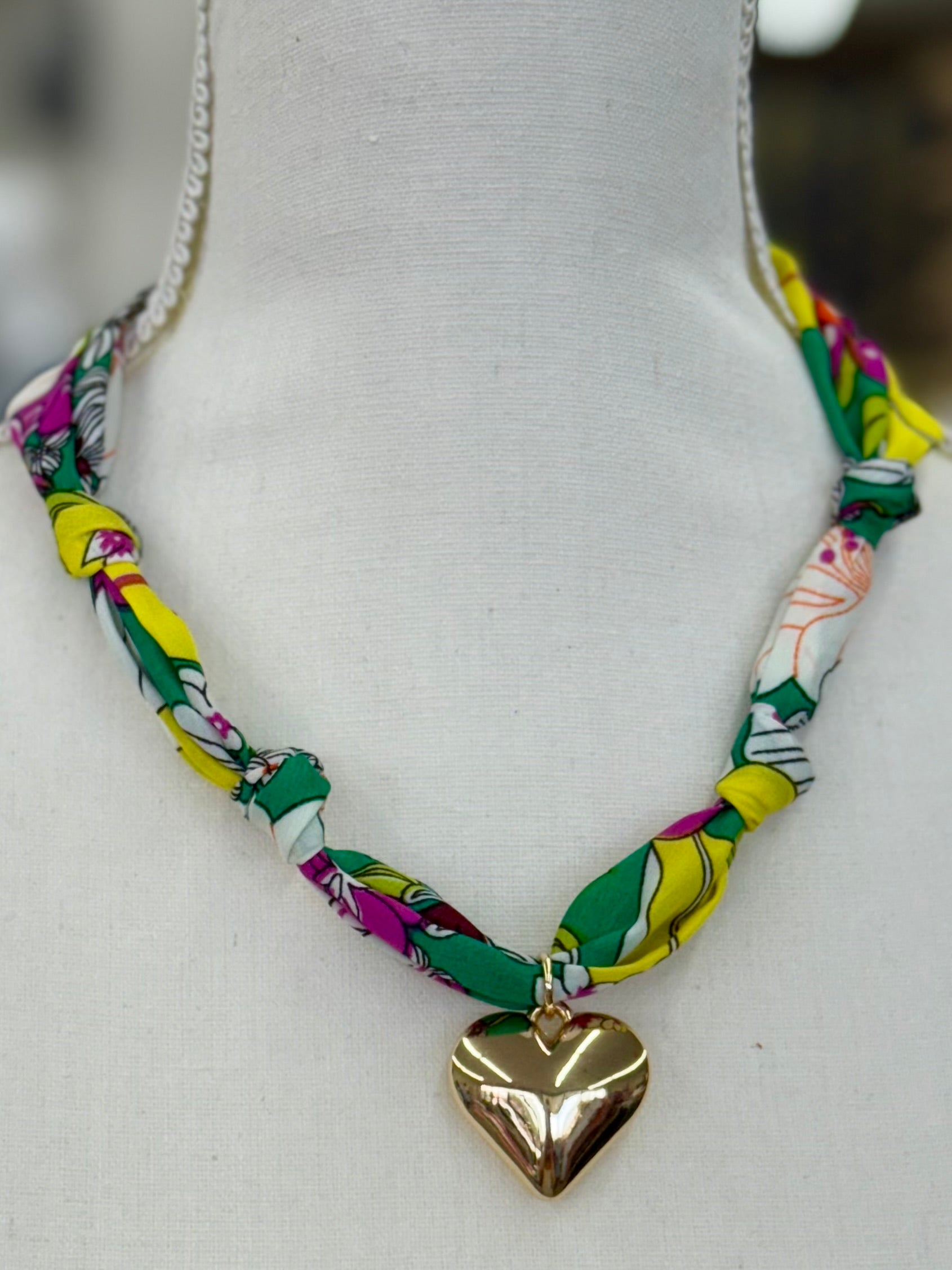 Handmade Scarf Necklace - Heart is a crafted with care, this soft fabric scarf doubles as a stylish necklace, featuring a delicate heart charm that adds a sweet, personal touch. Lightweight and versatile, it is perfect for layering.