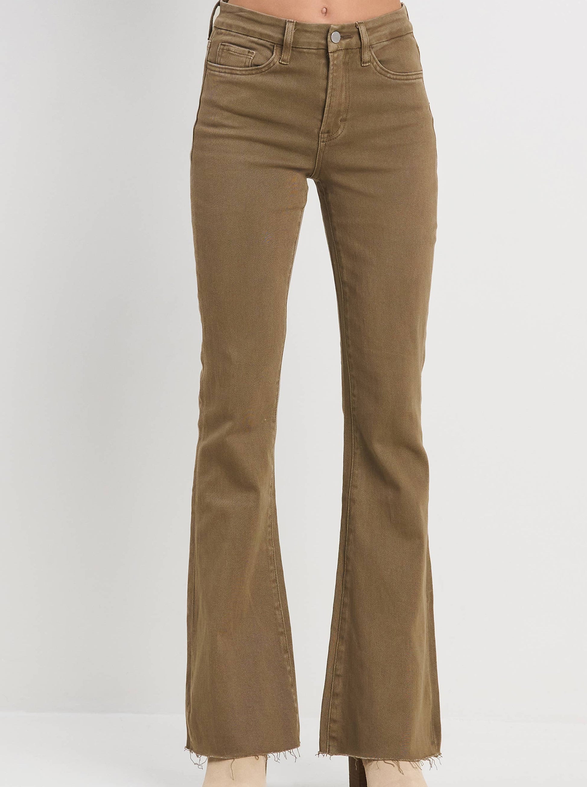 These army green flare jeans have a distinctive and eye-catching look. The army green color gives them a unique, military-inspired vibe, setting them apart from more traditional denim hues.